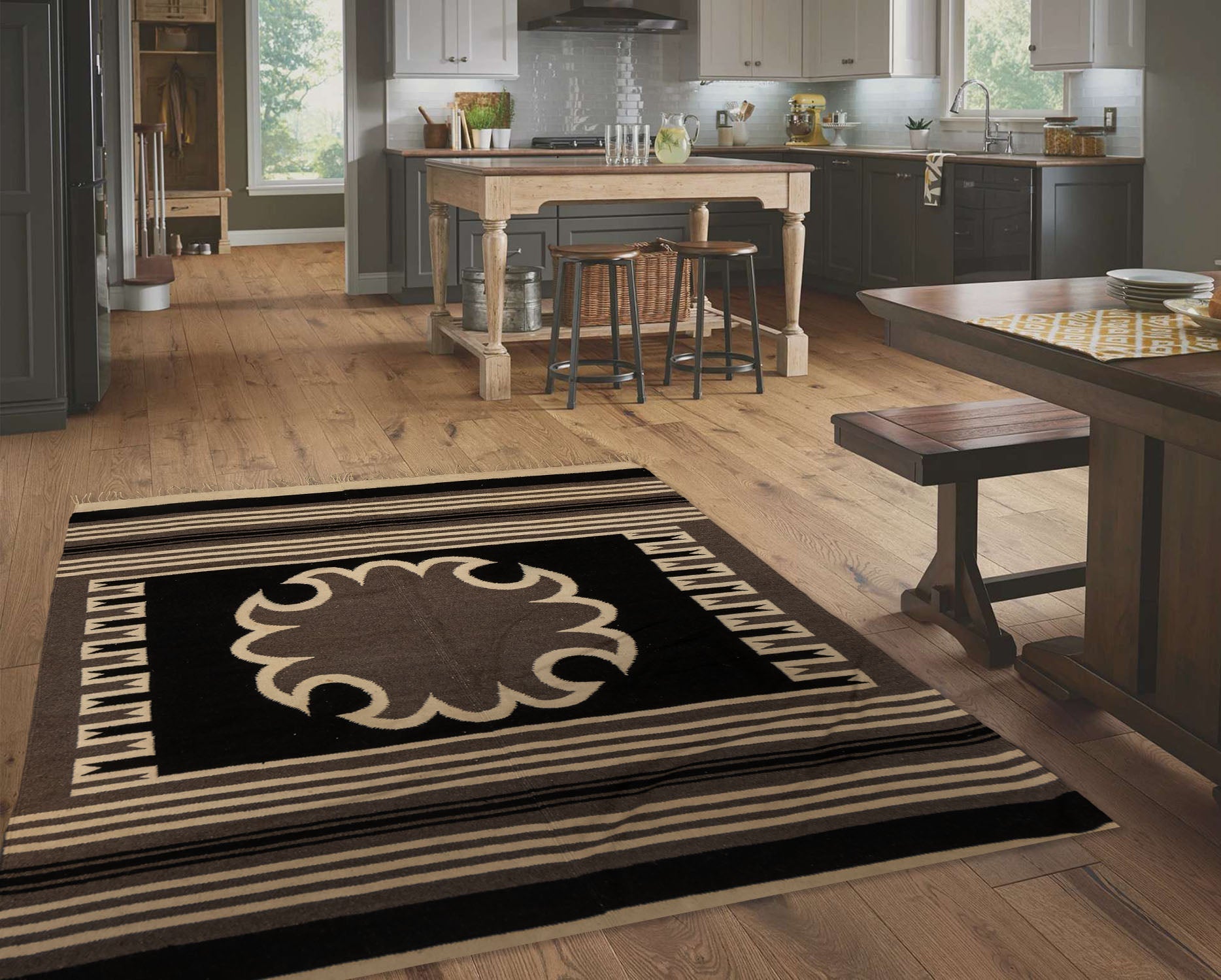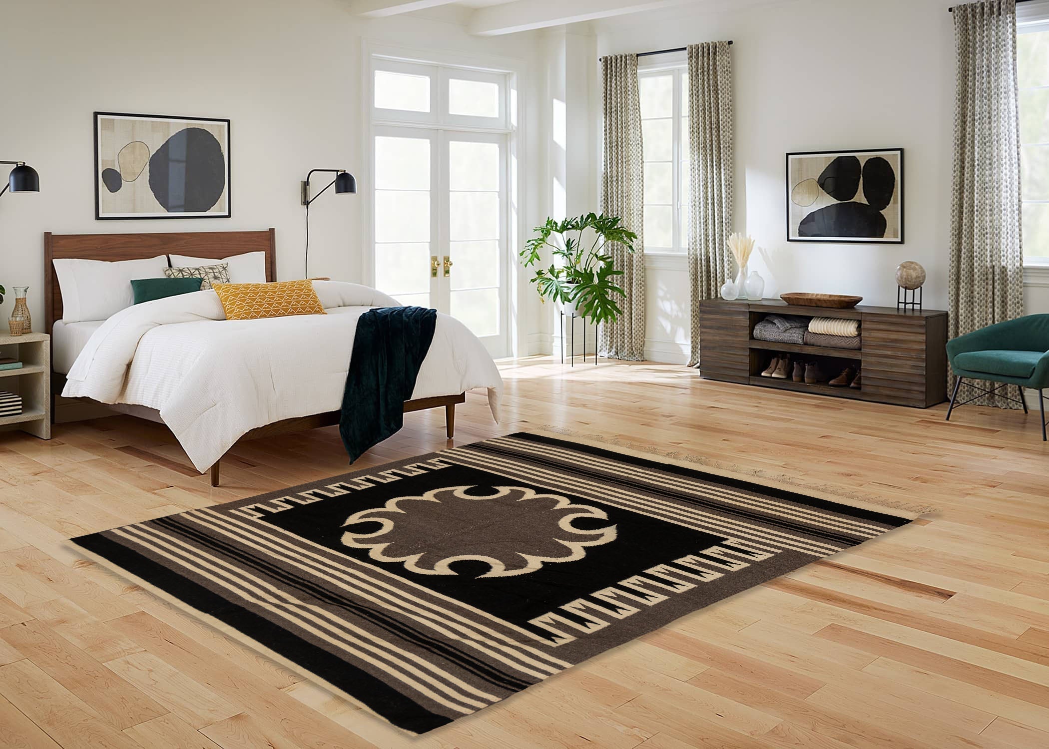 5' 5" x 6' 7" Mexican Flatweave 5X8 Black Ivory Wool Area Rug #007774