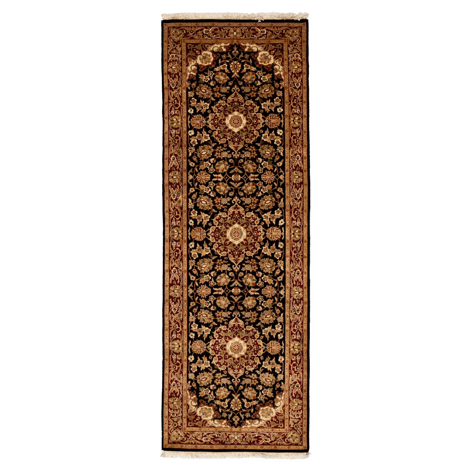 Tags black, Cotton, curvilinear, gold, green, hand knotted, India, Maharaja, owned, red, repeating motifs, rugs, Rugs for Sale, runner, saturated, showroom, traditional, wool